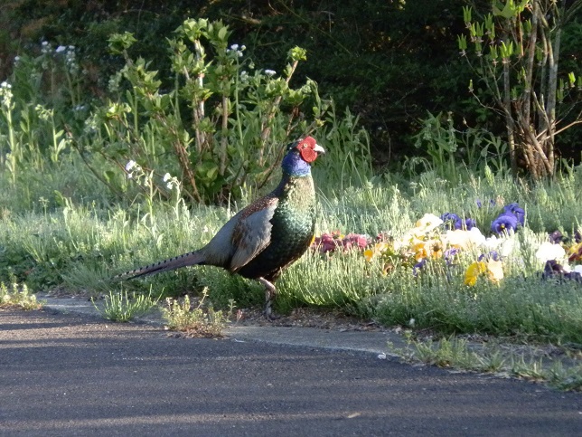 (以前から鳴き声は聞こえていましたが、やっと姿を現してくれました♫キジの雄です。キレイですねぇ・・・堂々とした姿です)