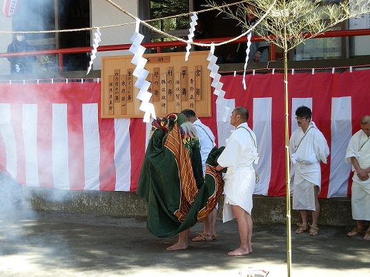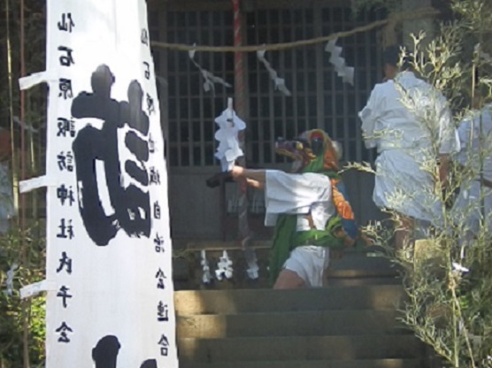 五穀豊穣と無病息災を祈る伝統行事で毎年3月27日に、神池での水行、保存会により伝承されている「獅子舞」が行われています。獅子頭は悪魔払いと言われ、笹の葉でまかれる煮たった湯にあたるとその年は病気をしないそうです、江戸時代から続く「湯立獅子舞」のご利益にあやかろうと、多くの人が来られていました。