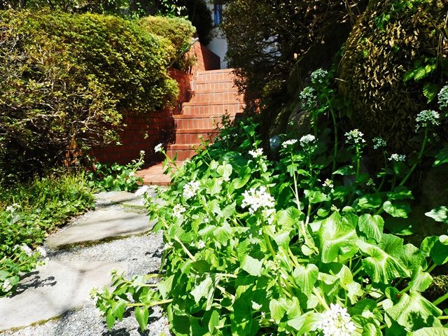 玄関に植え付けた葉ワサビが可愛い白い花を咲かせました