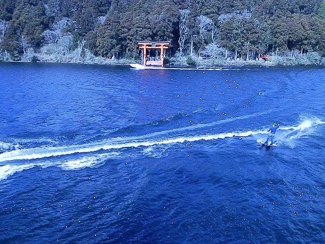 まずは芦ノ湖畔の第一鳥居から、箱根神社まで鬼さん達と歩きます!